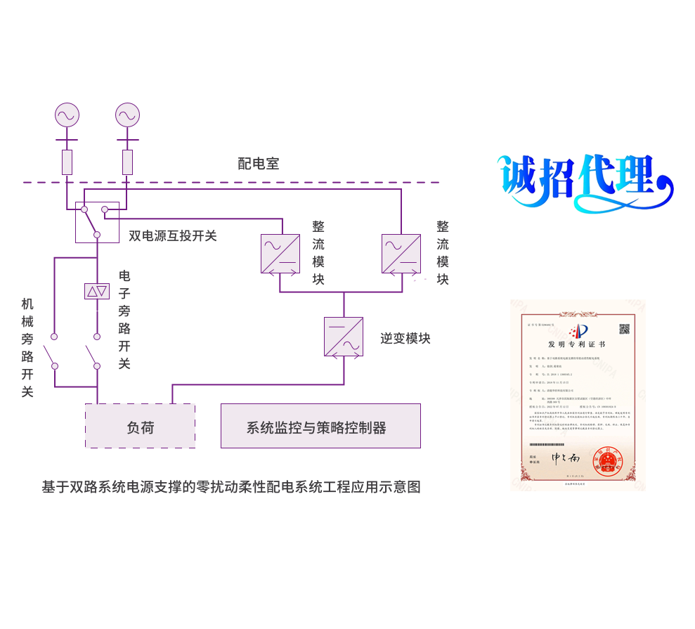 基于双路系统电源支撑的零扰动柔性配电解决方案采用双路独立交流电源经整流变换成直流实现并列运行,再经逆变器变换成交流给终端用电设备供电,实现在任何一路供电电源发生瞬时(毫秒级)、短时(秒级)或长时扰动时,保证对配电终端设备供电“零扰动”,能够完全避免电力系统故障和倒闸操作对终端用电设备产生扰动。
